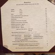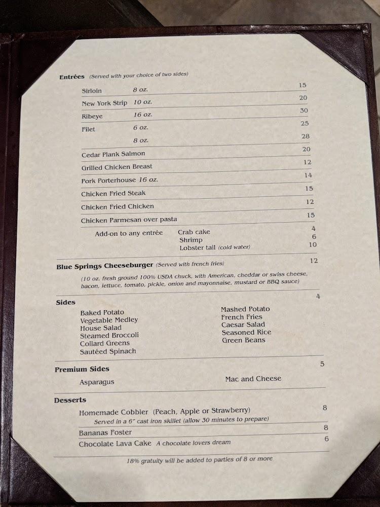 Pricing is quite reasonable, with most entrées averaging around $18.27, making it accessible for many. The diverse menu ensures that everyone, regardless of preference, can find something delicious to enjoy at Blue Springs Grill.
